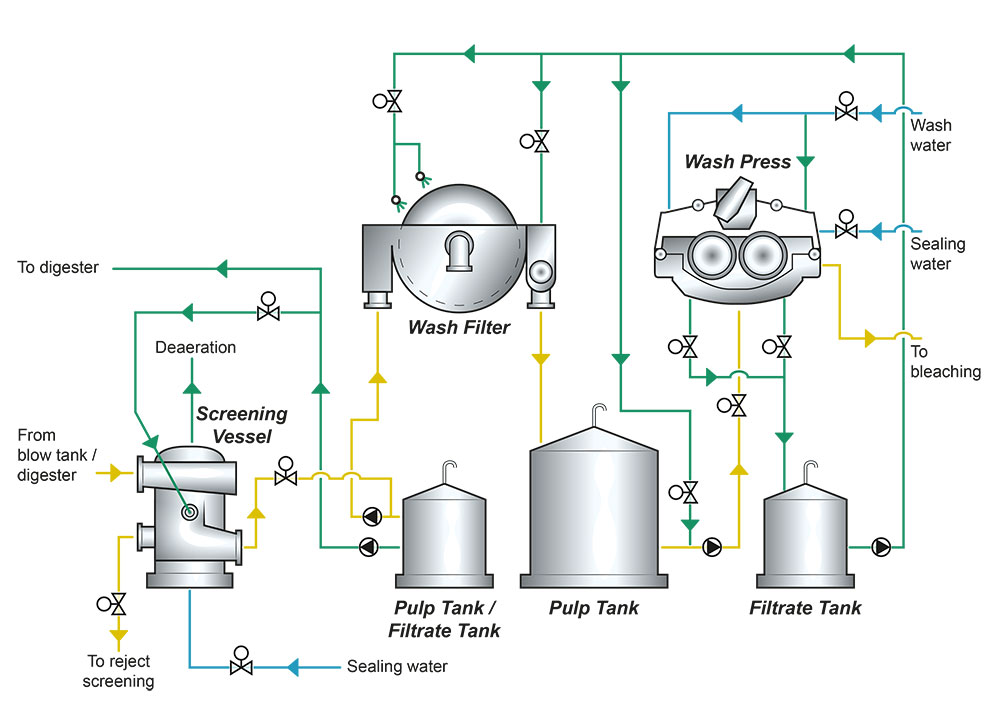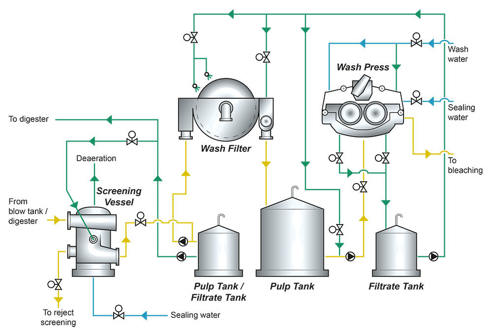 The washing process is designed to separate the black liquor from the pulp fibers as efficiently as possible with a minimum of dilution of the liquor. The equipment used can be wash filters, wash presses, continuous diffusers etc.