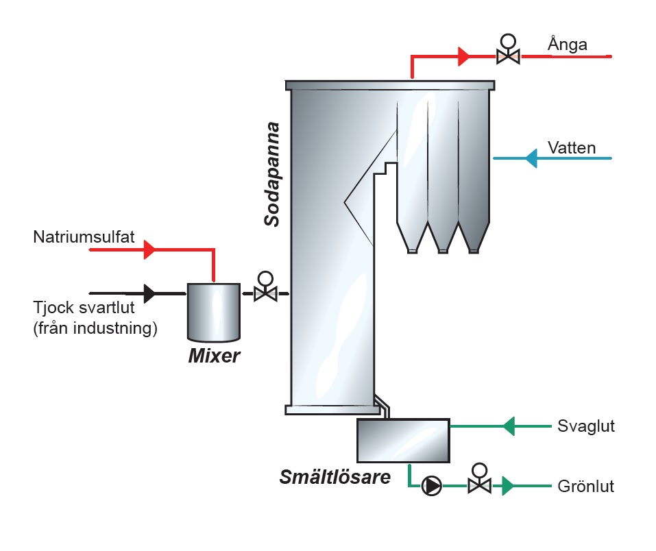 Den tjocka svartluten från indunstningen förbränns i sodapannan- en stor ångpanna. Denna process har två mål: