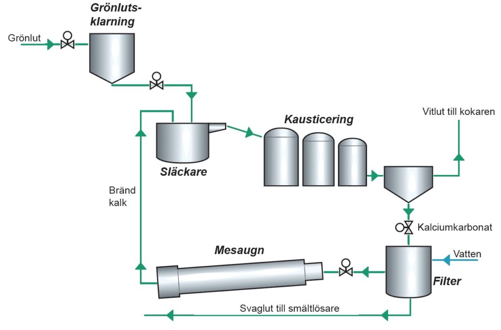 Samtidigt bildas s.k. mesa (kalciumkarbonat CaCO3) som separeras och tvättas, filtratet är s.k. svaglut. Vi har nu ny kokvätska som kallas vitlut (även om den faktiskt är något gul). Den tvättade mesan bränns i en mesaugn vid hög temperatur för att producera bränd kalk igen.
